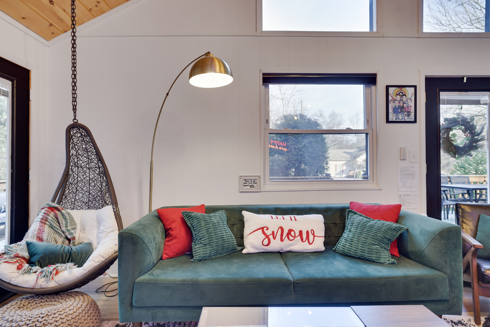 At 900sqft, this sweet little cabin feels quite expansive when you walk into the open kitchen, dining and living space. Completely renovated with a beautiful woodclad cathedral ceiling, floor to ceiling windows bringing in an abundance of natural light, a comfy emerald-green sofa, bright white kitchen, and a retro dining space, you won't know what to explore first. You will see our slogan on the family room wall "Happy days are here again!" This is what we stand for and will do everything we can to ensure that you indeed have a happy stay.