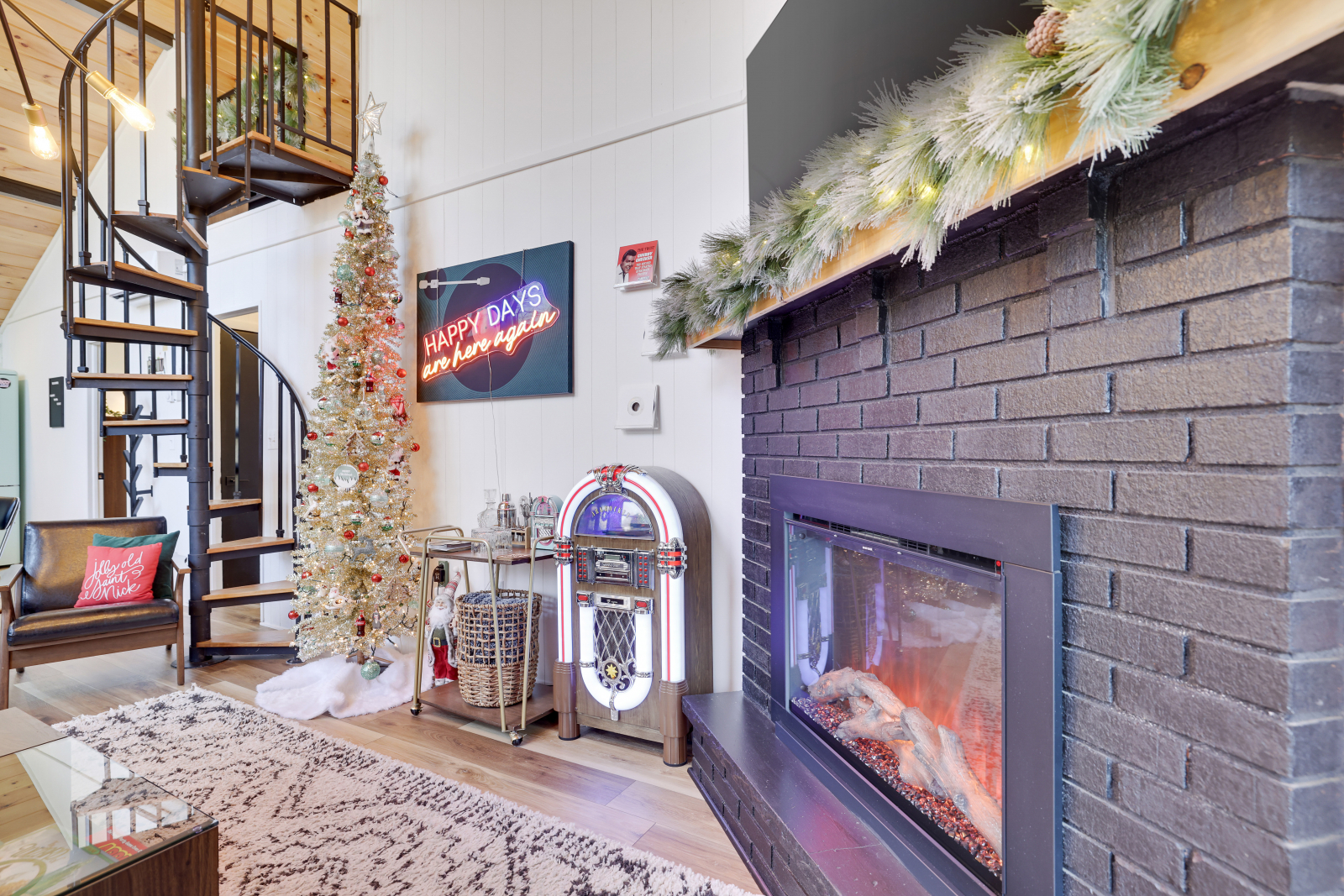 The Happy Days Chalet is located in the Pocono Mountains and is a professionally designed 50’s-themed cabin that gives a unique midcentury feel and experience; transporting you to the 50's with retro elements from the iconic television show Happy Days. With a retro fridge, vinyl and chrome dining area with real diners bench seating, neon lights and a full-sized jukebox, you”ll be amazed at every turn. The highspeed wifi, 55in smart TV and 6 person hot tub, also gives you the comforts and luxe of today. And dog friendly too!